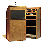 SEVILLE LECTERN (one piece) with built-in sound system One-piece floor lectern with built-in 70 watt sound system, electret microphone with extra sensitive miniature microphone with 18î slim gooseneck microphone, shock mounted mic input, auxiliary mic and line inputs, transformer-balanced mic level output, dual-intensity light, and tilt-n-roll casters. |